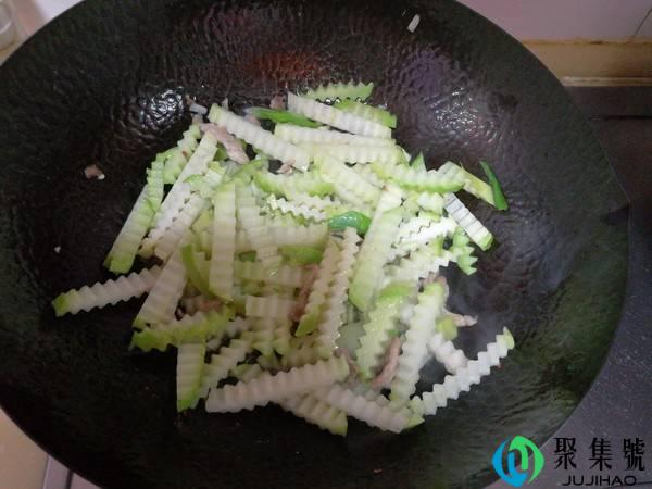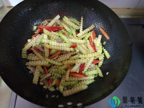 3、将苤蓝条放入锅中,翻炒一会,让苤蓝变软断生。