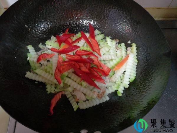 4、将胡萝卜、红辣椒放入锅中。