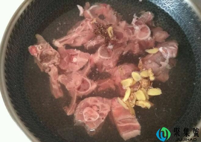 2、泡好的羊蝎子,凉水下锅焯水,参加少量花椒和姜片。