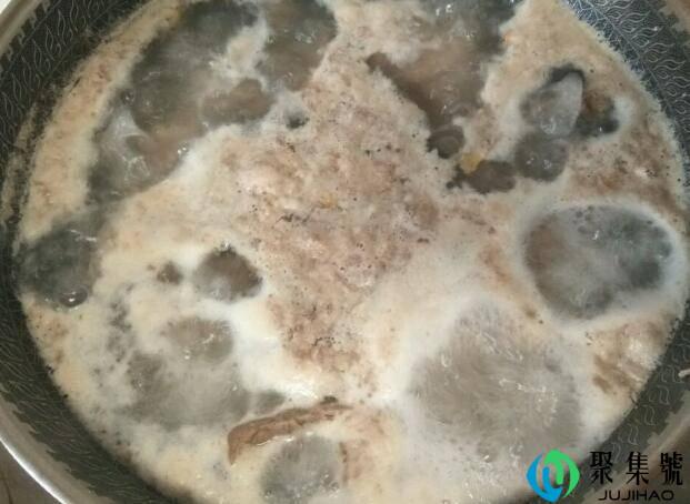 3、水开后撇去浮沫,将羊蝎子捞出备用,汤也留用。