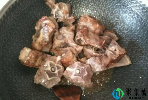 5、炒好糖色后,下入焯过水的羊蝎子停止煸炒,炒到每块肉都裹匀糖色。