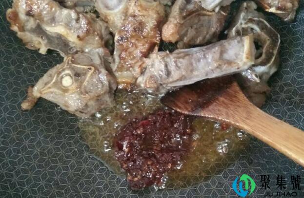 6、将炒好的羊蝎子推到锅的一边,露出油,在油里下入豆瓣酱,煸炒出红油(中小火)。