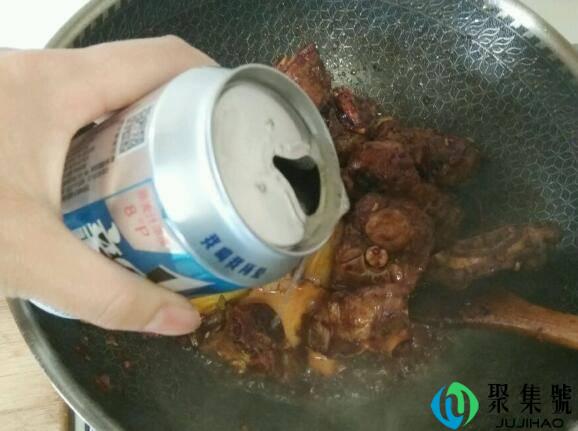 9、倒入一罐半的啤酒。啤酒烧开后,倒入砂锅里。参加适才焯肉撇去沫子后的肉汤,参加一小块的牛油暖锅料。
