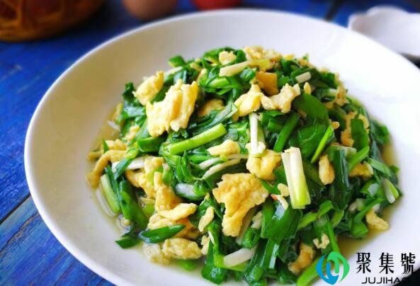 2、韭菜炒鸡蛋。把韭菜洗净切段,放入打好的鸡蛋碗里搅拌平均,放入少量咸盐,在油锅里炒鸡蛋。炒出来的鸡蛋颜色都雅,味道也鲜美。