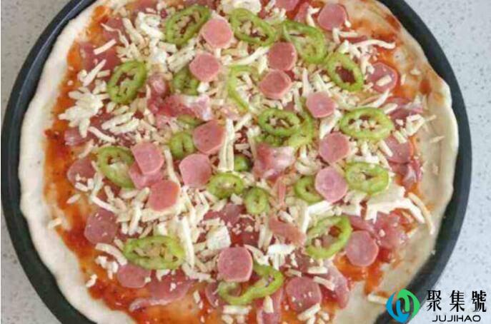 5、在上面铺一层芝士,将电饼铛调至烤蛋糕档,将电饼铛盖扣住后,用小火烤15分钟摆布即可完成披萨的造做。