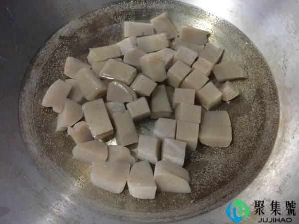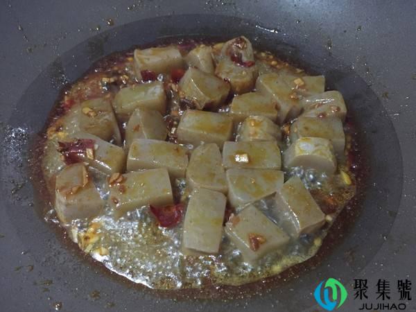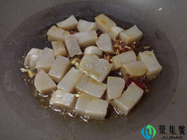 5、倒入控干水分的魔芋豆腐停止翻炒平均。