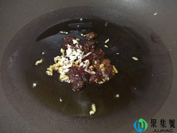 4、将锅先烧热,倒入凉油,将豆瓣酱倒入停止煸炒。
