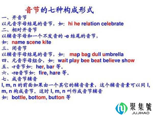 3、音节:音节是读音的根本单元,任何单词的读音,都是合成为一个个音节朗读。在英语中元音出格清脆,一个元音音素可构成一个音节,一个元音音素和一个或几个辅音音素连系也能够构成一个音节。一般说来,元音音素能够构成音节,辅音音素不清脆,不克不及构成音节。