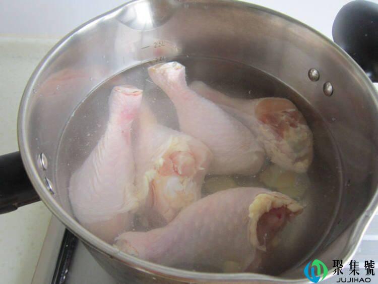 2、把姜洗净切片,鸡腿洗净,参加开水里,煮15分钟捞起,沥干水分。