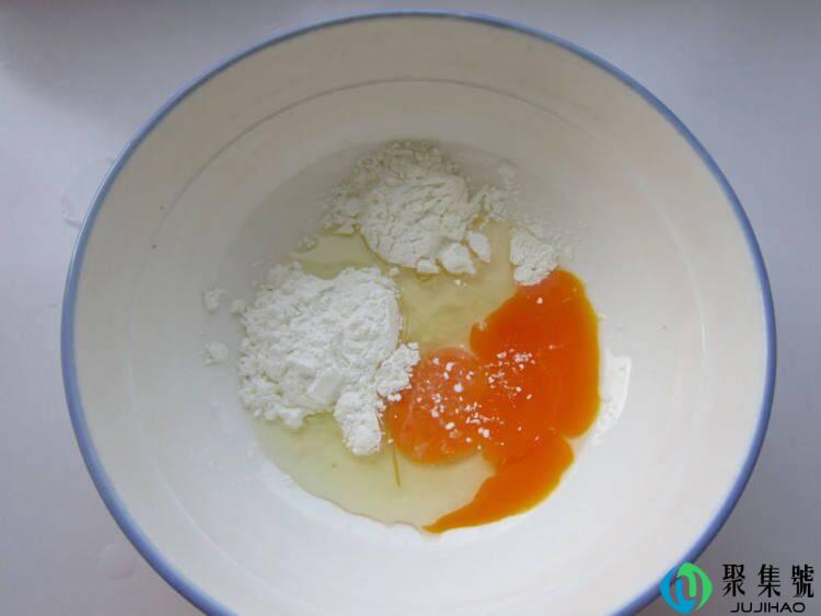 5、面粉、淀粉里加鸡蛋、少许水拌平均,调成蛋糊。