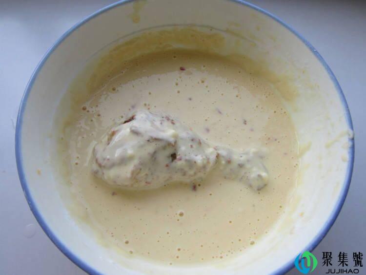 6、把腌造好的鸡腿加进去,平均的裹上蛋糊。