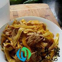 肉变色后,加料酒,酱油。最初倒入菠萝蜜丝,翻炒平均即可出锅。