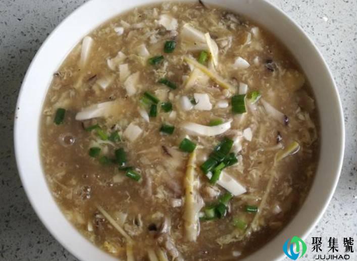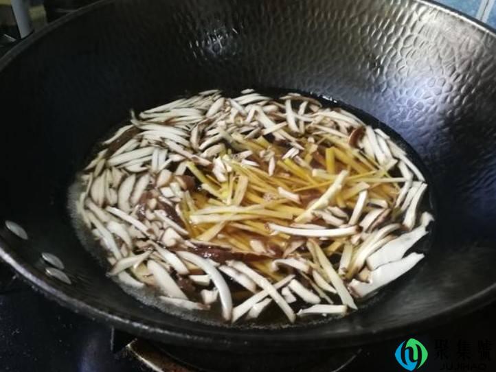 3、锅里放水,水煮开后,倒入一勺香醋。依次放入笋丝,香菇丝,肉丝,用筷子不断搅圈圈,煮五分钟摆布。