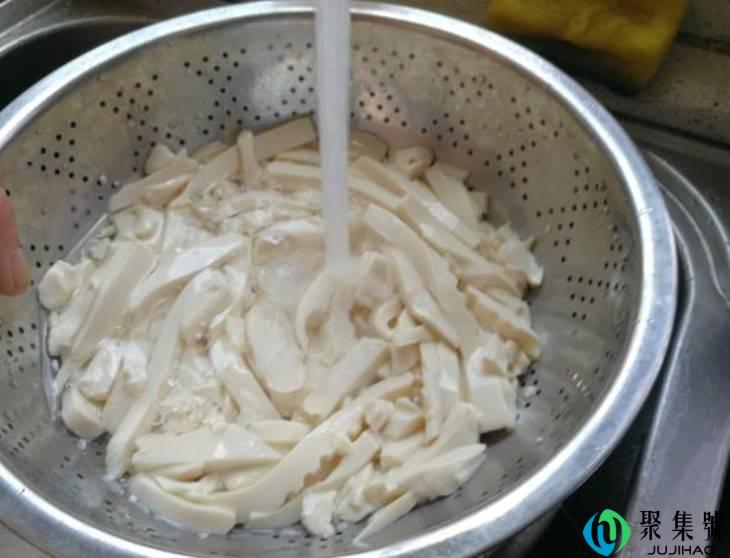 1、瘦肉、香菇、细笋切丝,鸡蛋打散;豆腐切丝后用清水泡着。用玉米淀粉加水芡汁备用。