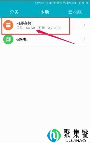 3、在当地”存储界面里面,部门手时机有两个选项,有的手机就只要内部存储”,我们点击内部存储”进入内部存储界面,如下图。