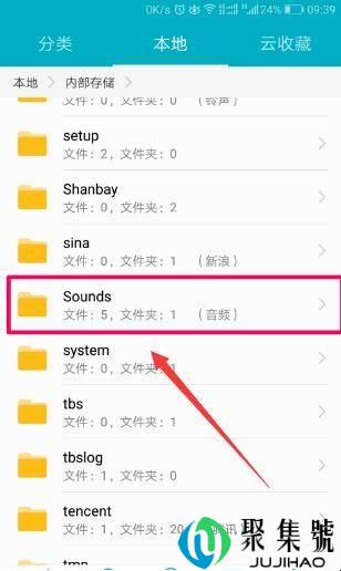 4、在内部存储中就存放着我们手机的所有文件夹,在那么些文件夹中Sounds”文件夹就是我们手机灌音文件存放的文件夹,我们点击Sounds”进入,如下图。