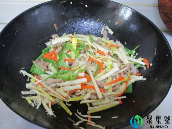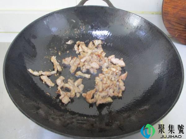 5、再把猪肉丝回锅,烹入少许开水不竭的翻炒至熟。