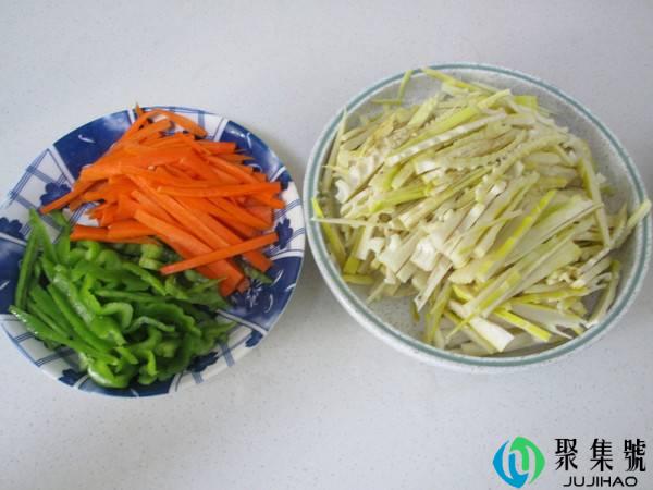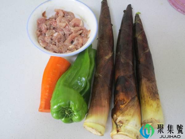 1、备好麻竹笋,青椒和胡萝卜,猪肉丝里参加1克盐,黄酒和生粉抓匀腌造20分钟。