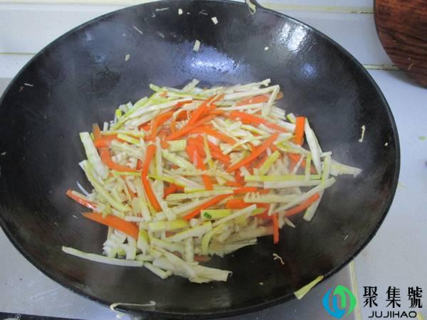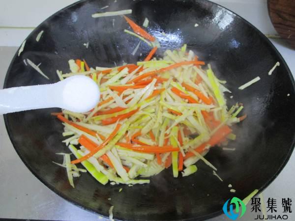 4、锅内留油,倒入笋丝和胡萝卜煸炒至出香味加盐调味。