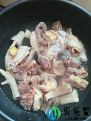 7、换砂锅或炖锅。下冷水、姜片、鸡肉,煮开。