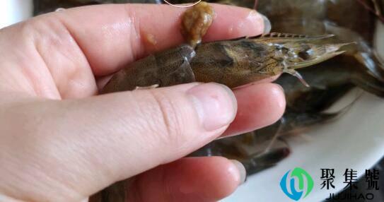 2、将虾线去除清洁,用左手抓住虾背,右手捏住虾头一挤,然后渐渐地将虾线拽出来。