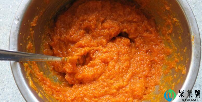 1、南瓜去皮去籽,切块上锅蒸熟,碾成泥。