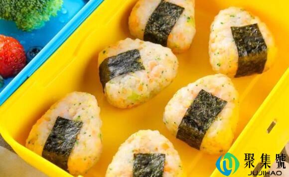 用料:二米饭100克、芋头30克、三文鱼25克、西兰花10克、海苔6片、熟白芝麻2克、柠檬适量。