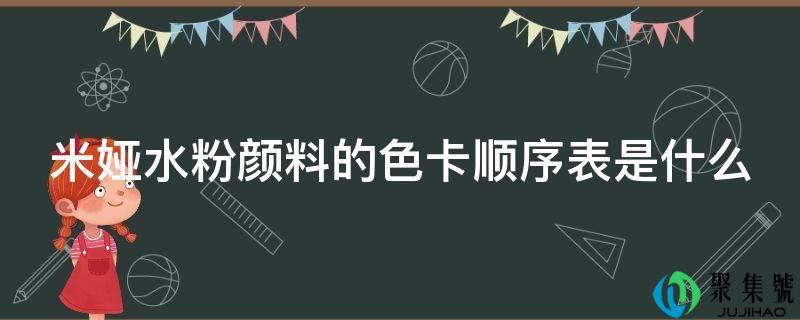 米娅水粉颜料的色卡由左至右、由上至下顺序为:熟褐、灰色、土黄、深黄、国美绿、橄榄绿、墨绿、黑色、釉里红、红赭石、桔红、中黄、拉丁黄、橄榄灰、翠绿、普兰、玫瑰红、高粱红、桔黄、淡黄、黄绿、浅绿、景德、群青、深红、香苹果、桃红、嫩黄、马尔代夫、松石绿、蟹青、青莲、国美红、粉红、肉色、柠檬黄、青频绿、松石、爱情海、紫罗兰、大红、紫薇、米驼、那坡里黄、起司、国美兰、紫丁香、钴蓝、朱红、英伦、牙黄、钛白、钛白、云尼拿、天蓝、湖蓝。