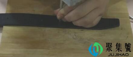 3、将打孔器对着画下的标记,用锤子或者砖头将皮带打穿即可。