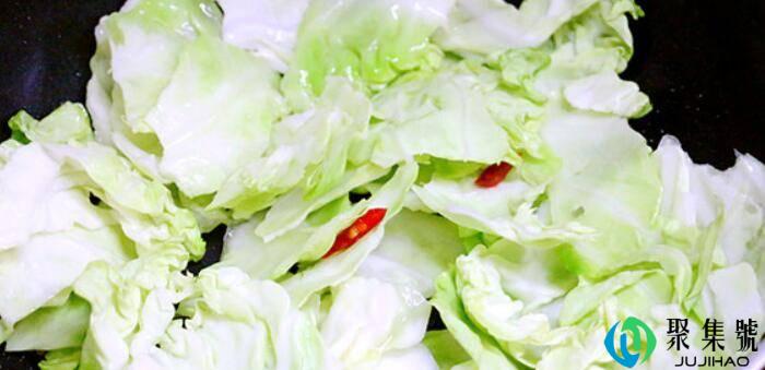 6、放入盐、白醋和少许白糖,翻炒至卷心菜断生即可。