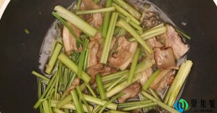 用料:猪肉300克、芹菜100克、食盐2克、水10毫升、酱油20克、葱5克。