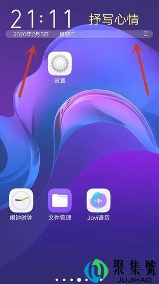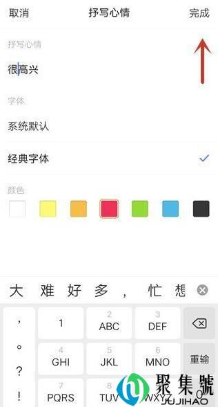 6、点击时间挂件上的编辑按钮,可以来到这个界面,在里面抒写心情、选择字体、设置字体颜色后,点击完成,可以设置好心情。