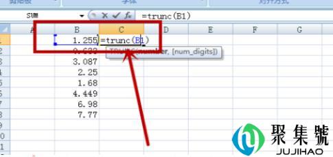 2、然后在C列输入函数:=trunc(B1),然后按回车(Enter键)。