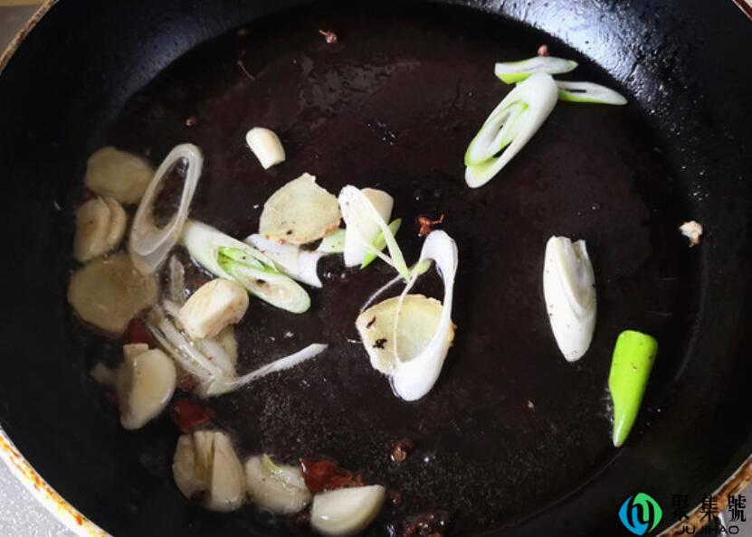 6、平底锅里留油,放入葱丝和姜片爆香。