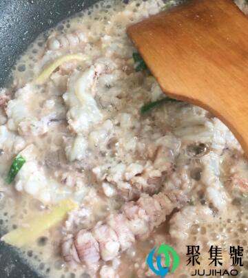 2、热锅倒油放姜丝炝锅,放入皮皮虾肉翻炒2分钟,加少许温水和适量料酒煮3分钟。