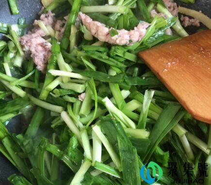 3、3分钟后放入韭菜翻炒2分钟,放入适量盐、大牛肉粉(鸡精)出锅即可。