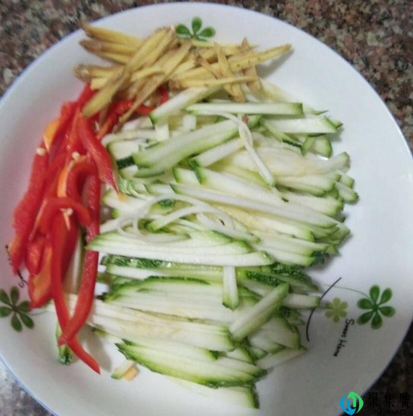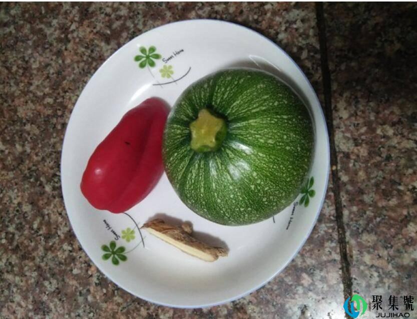主料:嫩南瓜1个、红椒1个、姜3片。