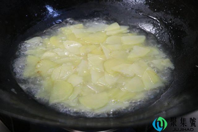 2、锅中加入油,大火翻炒土豆,加入少许盐调味。