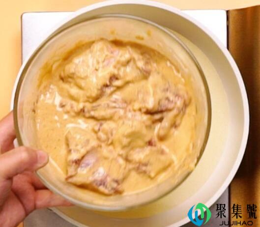 2、放入排骨,倒入香脆炸鸡粉、料酒、清水,抓匀腌制1小时。