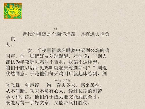 据《晋书·祖逖传》记载,祖逖(tì)(266—321),字士稚,晋代范阳遒(qiú)县(今河北省涞水县)人,他从小死了父亲,依靠哥哥抚养长大。由于性格豪放,不受拘束,到十四五岁时还不肯好好读书。后来,祖逖感到自己这样下去没有什么出息,就检点行为,认真读书。几年里,他不但博览群书,而且经常到京城洛阳去寻师访友,探讨学问,增长了许多知识和才能,渐渐受到人们的称赞。