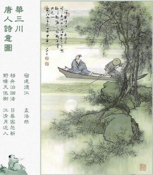然而,言虽止,意未尽。试想,此刻那亲近的明月会在诗人的心中引起什么呢?似有一丝喜悦,一点慰藉,但终究驱散不了团团新愁。新愁知多少?“皇皇三十载,书剑两无成。山水寻吴越,风尘厌洛京”(《自洛之越》)。诗人曾带着多年的准备、多年的希望奔入长安,而今却只能怀着一腔被弃置的忧愤南寻吴越。此刻,他孑然一身,面对着这四野茫茫、江水悠悠、明月孤舟的景色,那羁旅的惆怅,故乡的思念,仕途的失意,理想的幻灭,人生的坎坷……千愁万绪,不禁纷来沓至,涌上心头。“江清月近人”,这画面上让我们见到的是清澈平静的江水,以及水中的明月伴着船上的诗人;可那画面上见不到而应该体味到的,则是诗人的愁心已经随着江水流入思潮翻腾的海洋。这一隐一现,一虚一实,相互映衬,相互补充,正构成一个人宿建德江,心随明月去的意境。是的,这“宿”而“未宿”,不正意味深长地表现出“日暮客愁新”吗?“人禀七情,应物斯感;感物吟志,莫非自然”(刘勰《文心雕龙·明诗》)。孟浩然的这首小诗正是在这种情景相生、思与境谐的“自然流出”之中,显示出一种风韵天成、淡中有味、含而不露的艺术美。意思是把小舟停靠在河中间的小块陆地。移舟泊烟渚:旅途中暂时把船停靠在烟雾迷蒙的江中小洲边上。