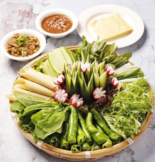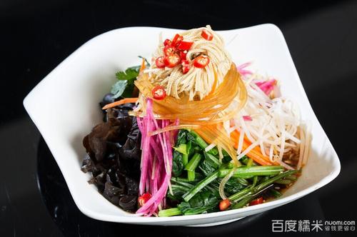凉菜拌九样主料:生菜、香菜、紫甘蓝、黄瓜、豆腐丝(熟)。辅料:油炸花生、鸽子蛋(熟)、干