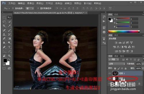 你说的镜像,就是上面的“水平翻转”或者“垂直翻转”。就是把这个文件的画面的宽度扩大一倍,然后把女孩的图片复制一个,ctrl+t,然后右键---水平翻转,然后移动好就行了。