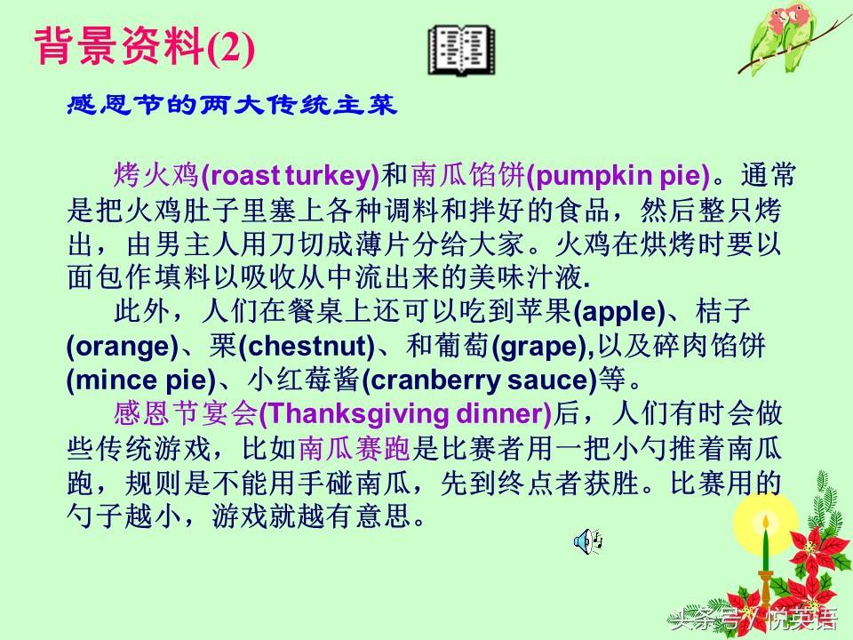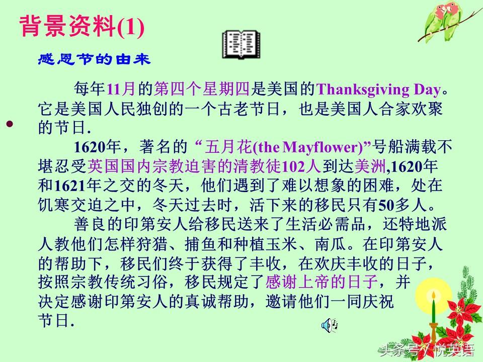 正文 感恩节的来历和意义(感恩节的来历和意义英文) 百科达人 V网站编辑 /2021-12-28 09:53:04 /310 阅读 1228 感恩节来历英文版Thanksgiving is a day for family members. No matter how far away they are, they’llget together for a reunion (团聚) and give thanks for the blessings they haveenjoyed in their life. 声明:本文内容及图片来源于读者投稿,本网站无法甄别是否为投稿用户创作以及文章的准确性,本站尊重并保护知识产权,根据《信息网络传播权保护条例》,如果我们转载的作品侵犯了您的权利,请在一个月内通知我们,我们会及时删除。请将本侵权页面网址发送邮件到laoyang1981@qq.com,我们会及时做删除处理。