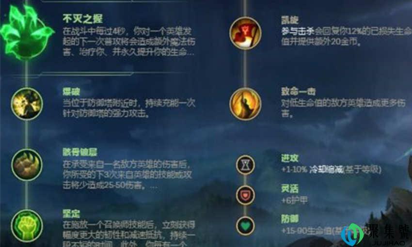 在符文方面推荐玩家点主系坚决,并且辅以副系精密,另外需要注意属性碎片1减CD+1护甲+1生命值的搭配方式。点出不灭之握,坚决系的符文增加坦度,精密系的符文致命一击配合R技能打出收割效率。