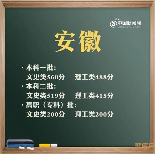 据安徽省教育招生考试院消息,文科一本560分,二本519分,高职(专科)200分;理科一本488分,二本415分,高职(专科)200分。