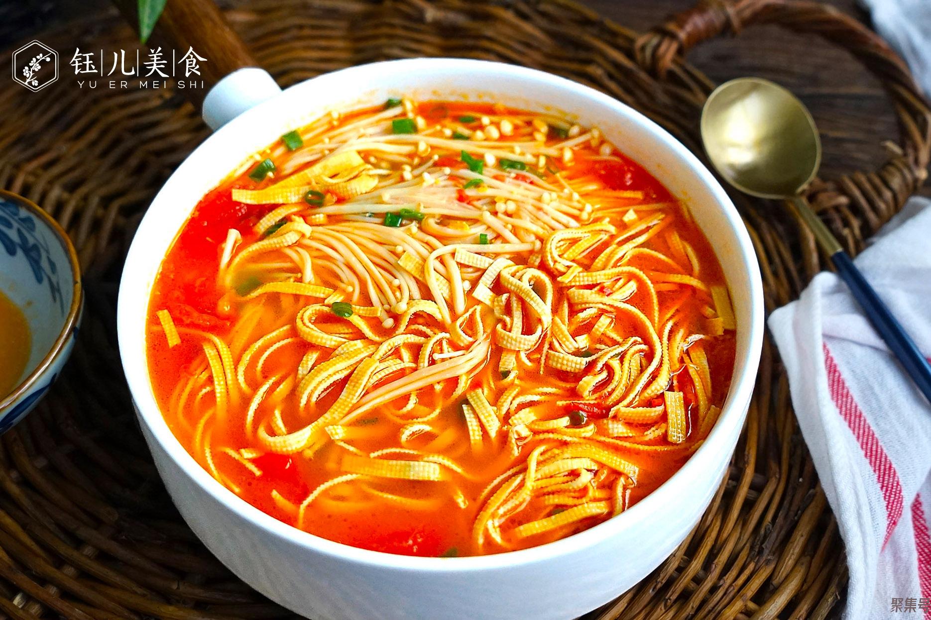 做法:1、千张切成条状,番茄切块打成汁,金针菇撕成小朵。2、千张焯水2分钟,捞出过凉水。3、热锅热油,倒入番茄汁、白糖熬制2分钟。3、倒入金针菇、盐、鸡精炖2分钟。4、再倒入千张炖1分钟,快出锅的时候撒入葱花即可。