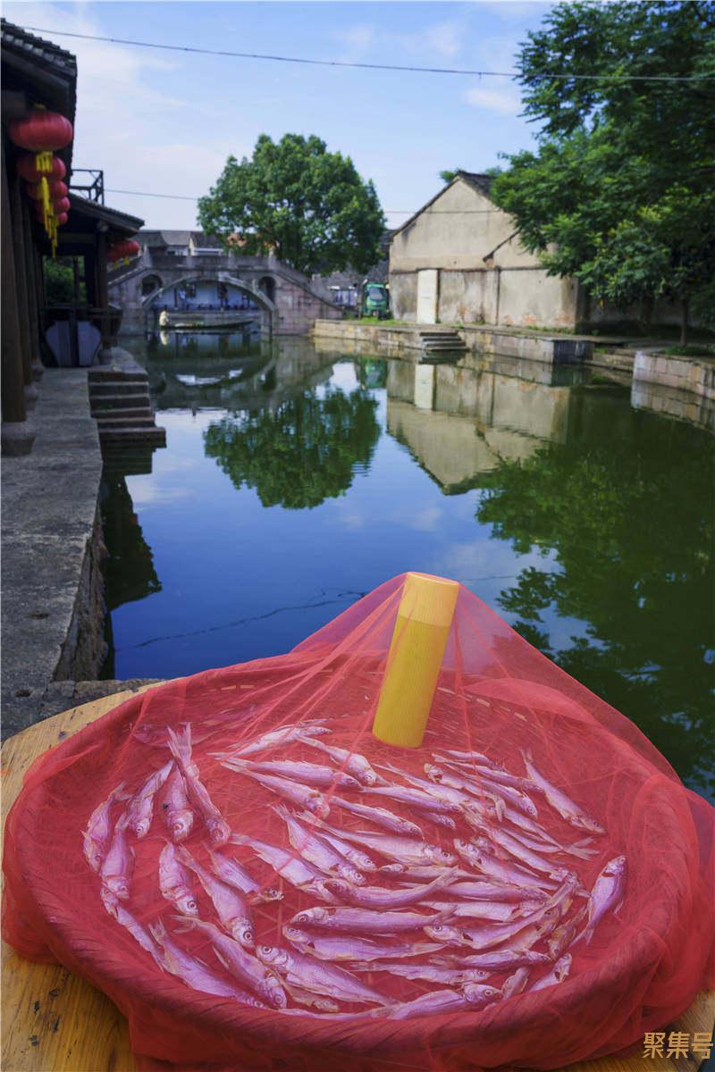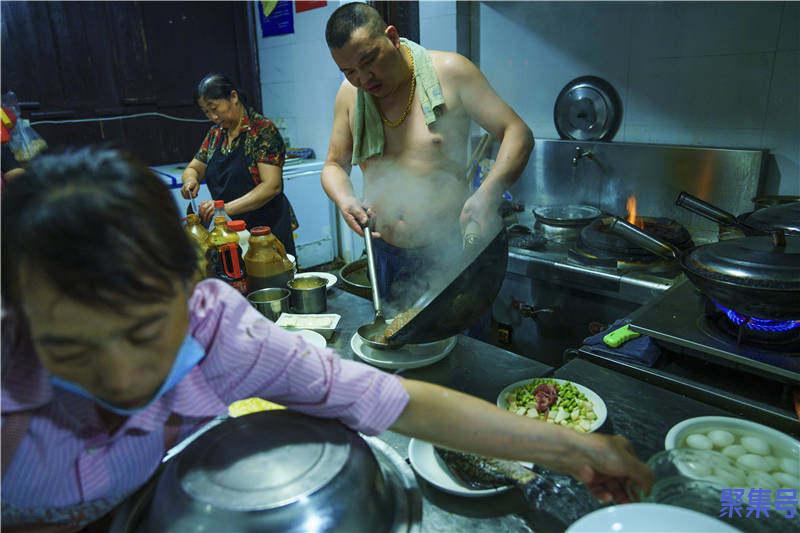 厨房里热火朝天,掌勺的陶大厨动作麻利得很,一个人守着四个灶台。江南的夏天太热,灶台边更是难待住人,陶师傅索性打了赤膊,脖子上的金链子明晃晃的,一身社会气,但一笑起来就露出了憨态。我们进厨房时,他正在做一条红烧鲫鱼,鲫鱼虽刺多,但在河鲜里却是肉质最细嫩鲜美的。只要肉质好吃,江浙人从不怕鱼刺多。