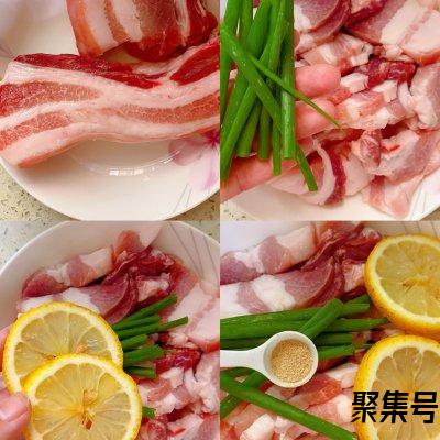 1、将五花肉清洗干净,切成稍微厚一点的肉片,放入葱段、胡椒粉、柠檬片抓拌均匀