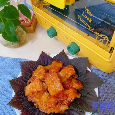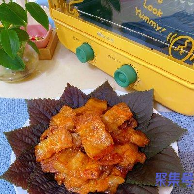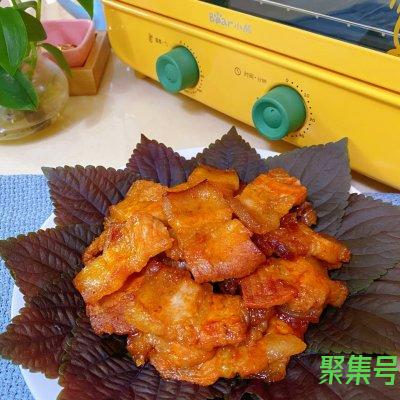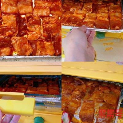 3、将腌制好的五花肉摆入铺好油纸的烤盘上,200度20分钟就烤好了。